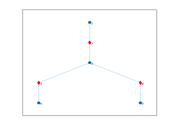 p2 = plot(tree,'MarkerSize',9); highlight(p2,5:7,'Marker','d','NodeColor','r')