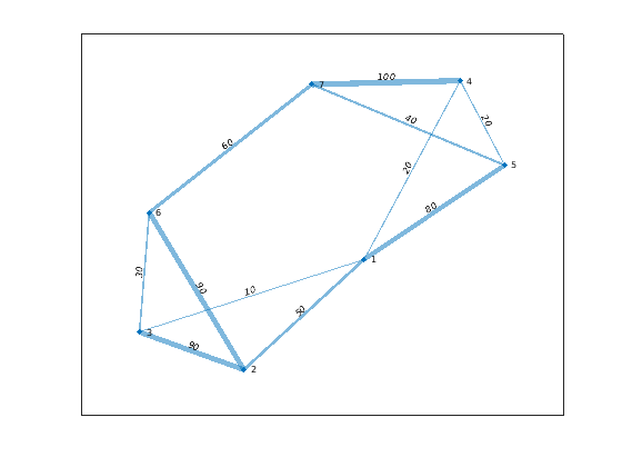 LWidths = 5*G.Edges.Weight/max(G.Edges.Weight); plot(G,'EdgeLabel',G.Edges.Weight,'LineWidth',LWidths)