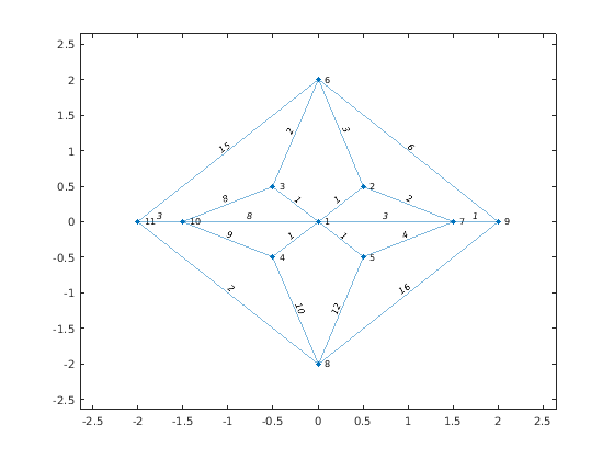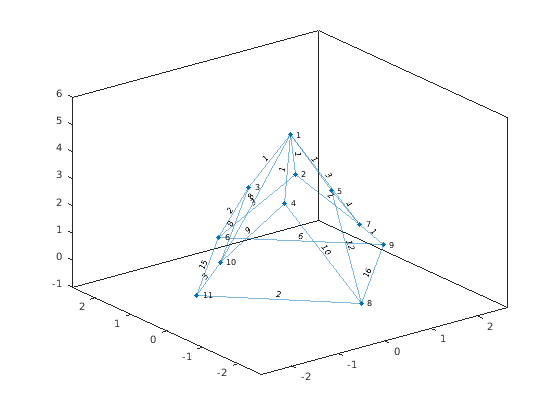x = [0 0.5 -0.5 -0.5 0.5 0 1.5 0 2 -1.5 -2]; y = [0 0.5 0.5 -0.5 -0.5 2 0 -2 0 0 0]; z = [5 3 3 3 3 0 1 0 0 1 0]; plot(G,'XData',x,'YData',y,'ZData',z,'EdgeLabel',G.Edges.Weight)