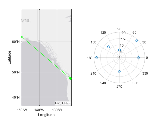 Создайте 1 2 мозаичное размещение графика. В первой мозаике отобразите географический график, содержащий линию, которая соединяет два города на карте. Во второй мозаике создайте график рассеивания в полярных координатах.