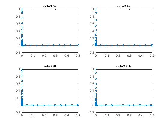 ode15s переменный шаг, переменный порядок (VSVO) решатель на основе числовых формул дифференцирования (NDFs) порядков 1 - 5. Опционально, это может использовать формулы дифференцирования назад (BDF, также известные как метод Гира), которые обычно менее эффективны. Как ode113, ode15s многоступенчатый решатель. Использование ode15s если ode45 сбои или очень неэффективны, и вы подозреваете, что проблема жестка, или при решении дифференциально-алгебраического уравнения (DAE) [1], [2].