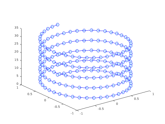t = 0:pi/20:10*pi; xt = sin(t); yt = cos(t); plot3(xt,yt,t,'-o','Color','b','MarkerSize',10,... 'MarkerFaceColor','#D9FFFF')