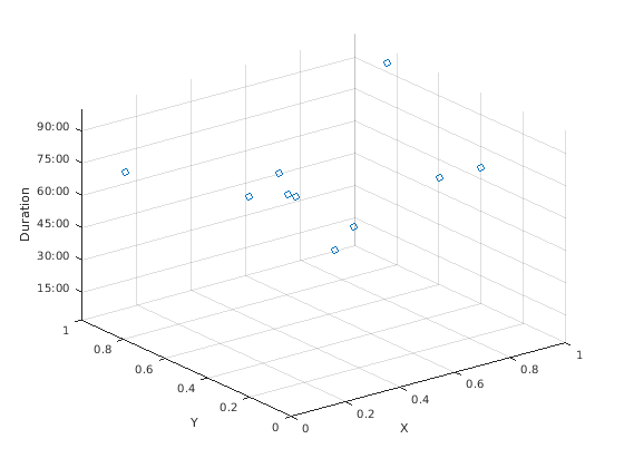 plot3(x,y,z,'o','DurationTickFormat','mm:ss') xlabel('X') ylabel('Y') zlabel('Duration') grid on