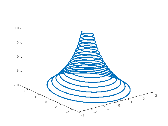 t = linspace(-10,10,1000); xt = exp(-t./10).*sin(5*t); yt = exp(-t./10).*cos(5*t); p = plot3(xt,yt,t);