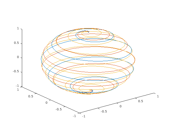 t = 0:pi/500:pi; xt1 = sin(t).*cos(10*t); yt1 = sin(t).*sin(10*t); zt1 = cos(t); xt2 = sin(t).*cos(12*t); yt2 = sin(t).*sin(12*t); zt2 = cos(t);
