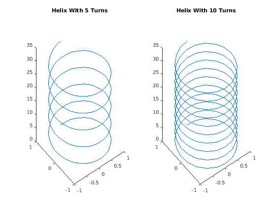 tiledlayout(1,2) % Left plot ax1 = nexttile; t = 0:pi/20:10*pi; xt1 = sin(t); yt1 = cos(t); plot3(ax1,xt1,yt1,t) title(ax1,'Helix With 5 Turns') % Right plot ax2 = nexttile; t = 0:pi/20:10*pi; xt2 = sin(2*t); yt2 = cos(2*t); plot3(ax2,xt2,yt2,t) title(ax2,'Helix With 10 Turns')