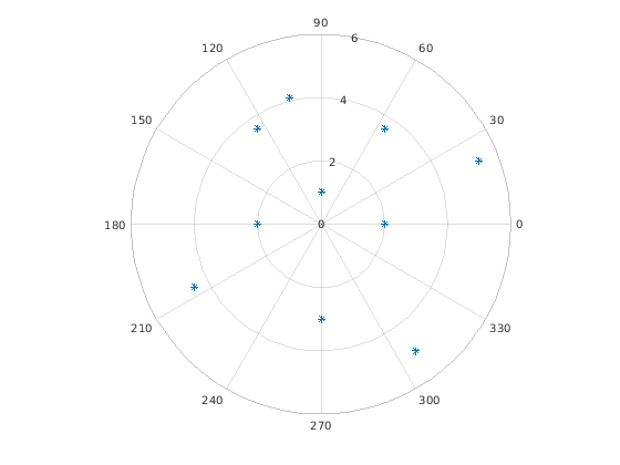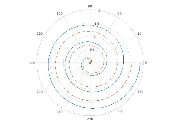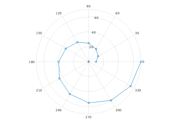 polarplot( строит график в полярных координатах, с theta,rho)theta указание на угол в радианах и rho указание на значение радиуса для каждой точки. Входные параметры должны быть векторами с равной длиной или матрицами с равным размером. Если входные параметры являются матрицами, то polarplot столбцы графиков rho по сравнению со столбцами theta. В качестве альтернативы одни из входных параметров могут быть вектором и другим матрица, пока вектор является той же длиной как одна размерность матрицы.