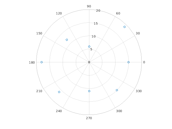 th = pi/4:pi/4:2*pi; r = [19 6 12 18 16 11 15 15]; polarscatter(th,r)