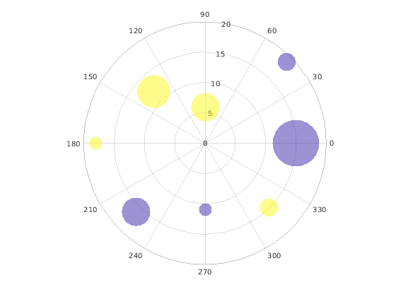 th = pi/4:pi/4:2*pi; r = [19 6 12 18 16 11 15 15]; sz = 100*[6 15 20 3 15 3 6 40]; c = [1 2 2 2 1 1 2 1]; polarscatter(th,r,sz,c,'filled','MarkerFaceAlpha',.5)