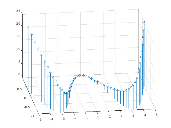 figure X = linspace(-5,5,60); Y = cos(X); Z = X.^2; stem3(X,Y,Z) view(-8,30)