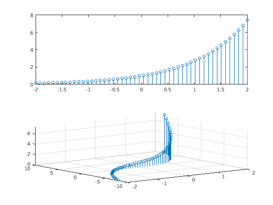 X = linspace(-2,2,50); Y = X.^3; Z = exp(X); tiledlayout(2,1) % Top plot ax1 = nexttile; stem(ax1,X,Z) % Bottom plot ax2 = nexttile; stem3(ax2,X,Y,Z)