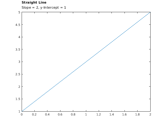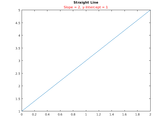 plot([0 2],[1 5]) title('Straight Line') subtitle('Slope = 2, y-Intercept = 1','Color','red')