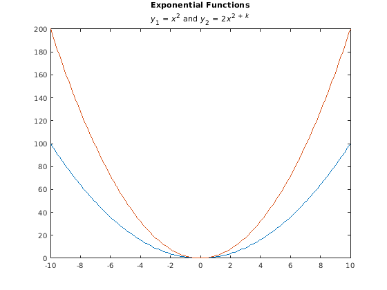 x = -10:0.1:10; y1 = x.^2; y2 = 2*x.^2; plot(x,y1,x,y2); title('Exponential Functions') txt = 'y_1 = x^2 and y_2 = 2x^{2 + k}'; subtitle(txt)