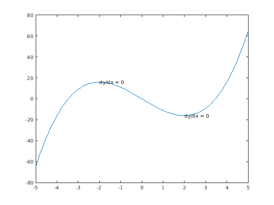 t = text([-2 2],[16 -16],'dy/dx = 0')