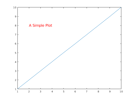 plot(1:10) text(2,8,'A Simple Plot','Color','red','FontSize',14)