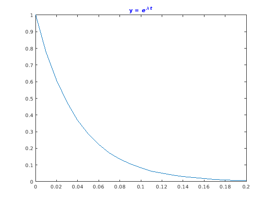 t = (0:0.01:0.2); y = exp(-25*t); figure plot(t,y) title('y = \ite^{\lambda t}','Color','b')