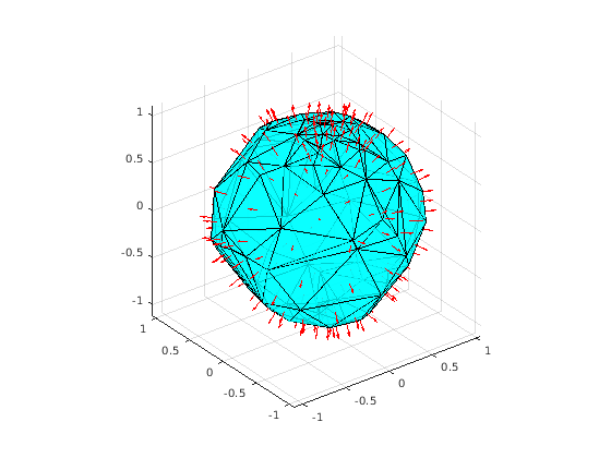 F = faceNormal( возвращает модульные векторы нормали во все треугольники в 2D триангуляции. TR)faceNormal функционируйте поддерживает 2D триангуляции только. F матрица с тремя столбцами, где каждая строка содержит модульные нормальные координаты, соответствующие треугольнику в TR.ConnectivityList.