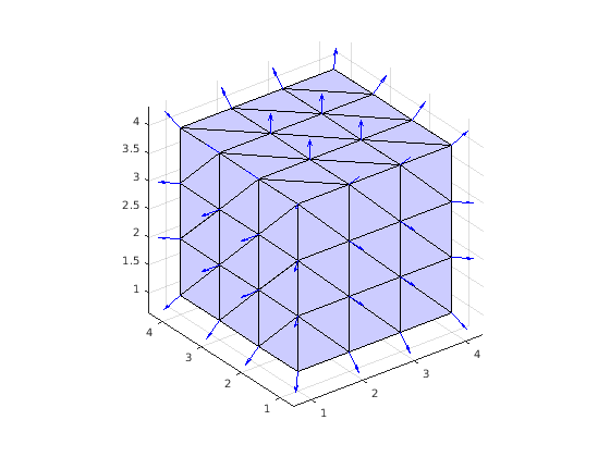 V = vertexNormal( возвращает модульные векторы нормали во все вершины в 3-D поверхностной триангуляции. TR)V матрица с тремя столбцами с каждой строкой, содержащей модульные нормальные координаты, соответствующие вершинам в TR.Points.