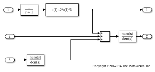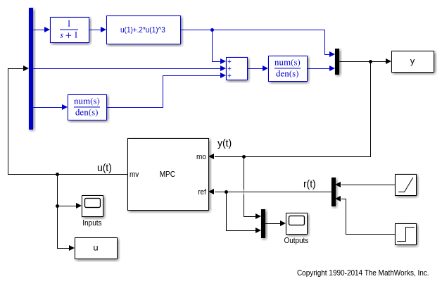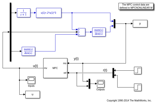 Нелинейный объект реализован в модели Simulink mpc_nonlinmodel. Заметьте нелинейность 0.2*u(1)^3 от первого входа до первого выхода.