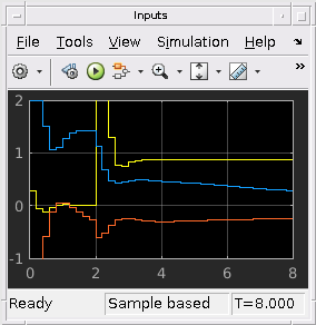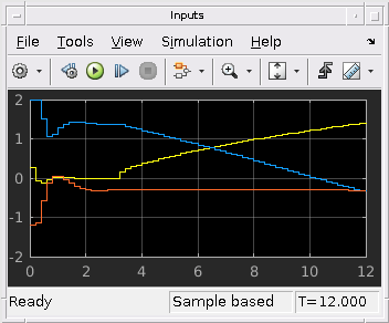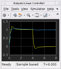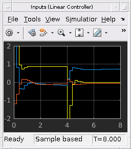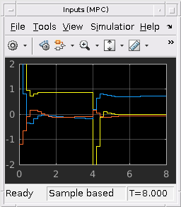 Несмотря на присутствие нелинейности, оба выходных параметров отслеживают свои ссылки много позже нескольких секунд, в то время как как ожидалось переменные, которыми управляют, остаются в рамках предварительной установки трудные ограничения.