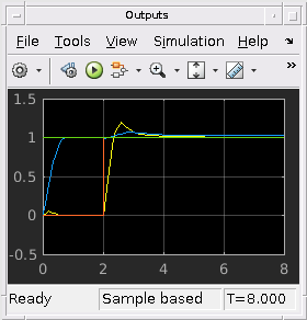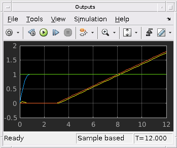 Откройте существующую ранее модель Simulink для симуляции с обратной связью. Это идентично предыдущей модели замкнутого цикла, за исключением того, что ссылка для первого объекта, выход больше не является шагом, а пандусом, сигнализирует что повышения с наклоном 0,2 после 3 секунд.