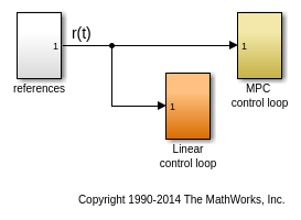 Откройте существующую ранее модель Simulink для симуляции с обратной связью. Блок "ссылок" содержит два сигнала шага (действующий после 4 и 0 секунд, соответственно), которые используются в качестве ссылки. Блок "MPC control loop" эквивалентен первому замкнутому циклу, за исключением того, что опорные сигналы предоставляются ему, как введено. Блок "Linear control loop" эквивалентен блоку "MPC control loop" за исключением того, что контроллер является блоком LTI, имеющим рабочую область ss объект LTI как параметр.