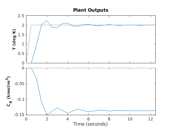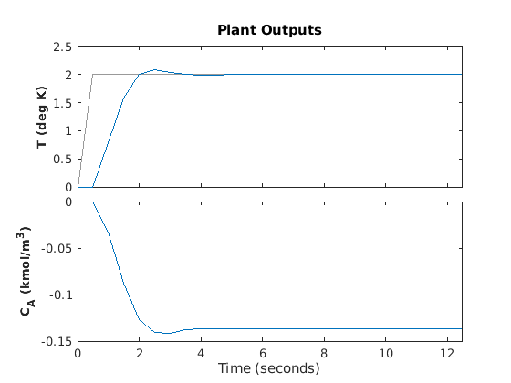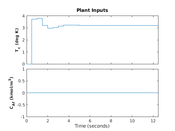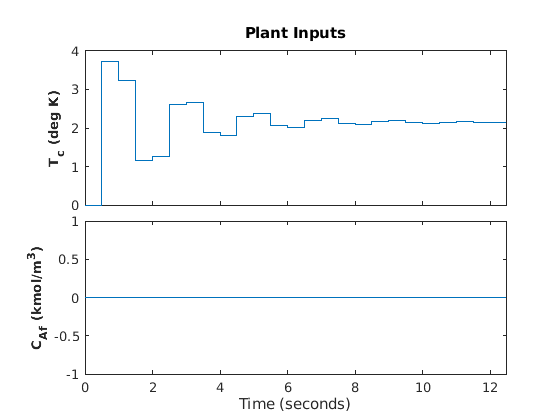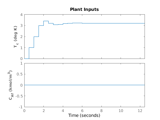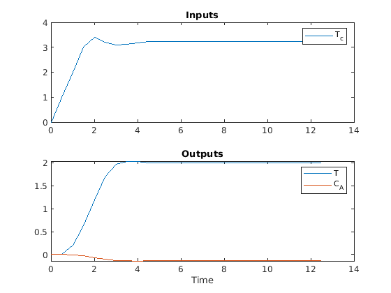 figure subplot(2,1,1) plot(t,u) title('Inputs') legend('T_c') subplot(2,1,2) plot(t,y) title('Outputs') legend('T','C_A') xlabel('Time')