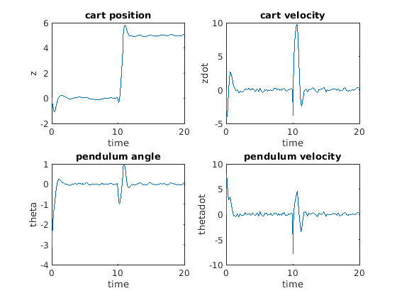 figure subplot(2,2,1) plot(0:Ts:Duration,xHistory(1,:)) xlabel('time') ylabel('z') title('cart position') subplot(2,2,2) plot(0:Ts:Duration,xHistory(2,:)) xlabel('time') ylabel('zdot') title('cart velocity') subplot(2,2,3) plot(0:Ts:Duration,xHistory(3,:)) xlabel('time') ylabel('theta') title('pendulum angle') subplot(2,2,4) plot(0:Ts:Duration,xHistory(4,:)) xlabel('time') ylabel('thetadot') title('pendulum velocity')