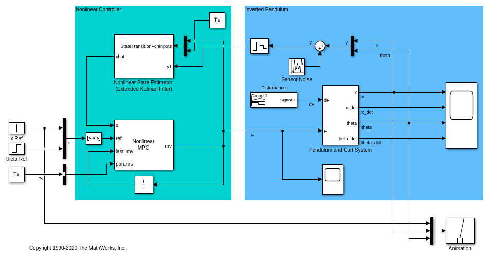 Этот пример использует нелинейный прогнозирующий объект контроллера модели и блок, чтобы достигнуть колебания и балансирующегося управления инвертированного маятника на тележке.