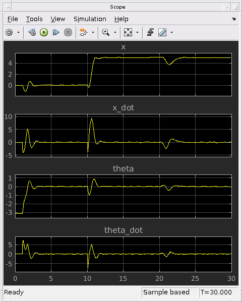 График положения тележки показывает, что тележка успешно перемещается в z = 5 за две секунды. В то время как тележка перемещается, маятник перемещен с пиковым отклонением 1 радиан (57 степени), и возвратился к инвертированному положению равновесия около времени 12 секунды.