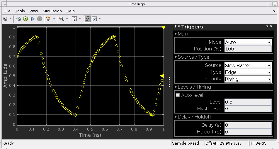 | Slew Rate | Амплитуда модели, времена взлета и падения и задержка распространения логических элементов |