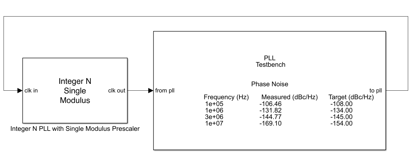 Откройте модель simplePLL присоединенный к этому примеру как вспомогательный файл. Модель состоит из Целого числа N PLL с блоком Single Modulus Prescaler и блоком PLL Testbench.