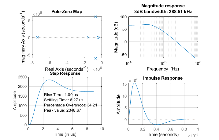 Анализ замкнутого цикла состоит из Нулевой полюсом Карты, Ответа Величины, Переходного процесса и Импульсной характеристики. Полосой пропускания на 3 дБ системы является 288.51 kHz. Система устойчива.