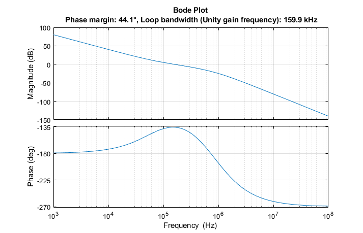 Анализ разомкнутого контура состоит из Диаграмм Боде системы PLL. Запасом по фазе является 44.1 степенями и частотой усиления единицы является 159.9 kHz.