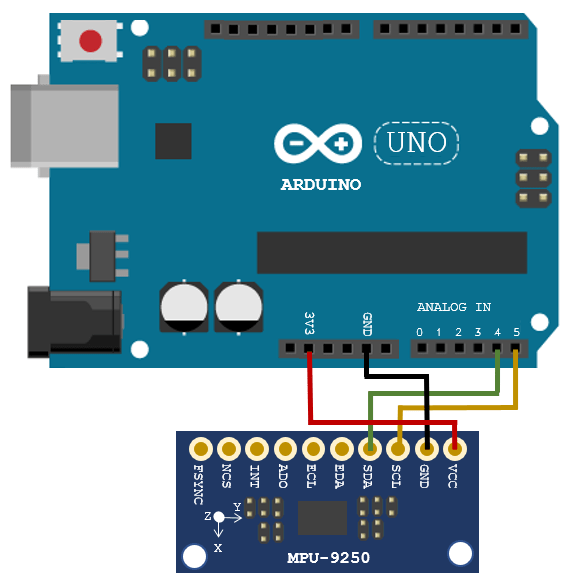 Соедините SDA, SCL, GND и контакты VCC датчика MPU-9250 к соответствующим контактам на Оборудовании Arduino®. Этот пример использует плату Uno Arduino со следующими связями: