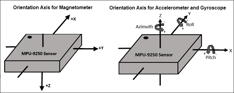 MPU-9250 является датчиком с 9 осями с акселерометром, гироскопом и магнитометром. Ускорение мер по акселерометру, скорость вращения мер по гироскопу и магнитометр измеряют магнитное поле в x-, y-и z-оси. Ось датчика зависит от того, чтобы делать из датчика.