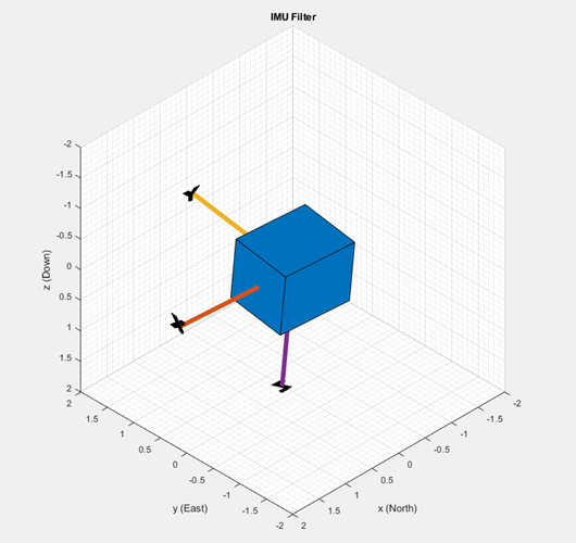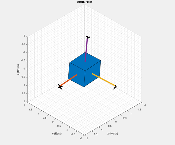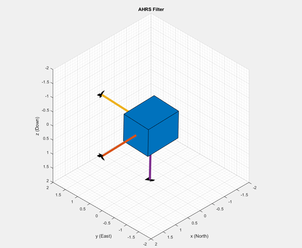 Следующие фрагменты кода используют ahrsfilter системный объект, чтобы определить ориентацию датчика и создает фигуру, которая обновляется, когда вы перемещаете датчик. Датчик должен быть стационарным перед запуском этого примера.