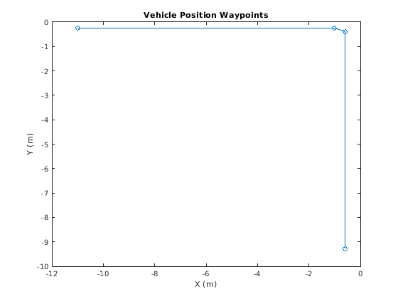 lla0 = [42 -71 50]; s = drivingScenario('GeoReference',lla0); v = vehicle(s); waypoints = [-11 -0.25 0; -1 -0.25 0; -0.6 -0.4 0; -0.6 -9.3 0]; speed = [1.5;0;0.5;1.5]; smoothTrajectory(v,waypoints,speed); figure plot(waypoints(:,1),waypoints(:,2),'-o') xlabel('X (m)') ylabel('Y (m)') title('Vehicle Position Waypoints')