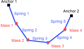 Этот рисунок показывает пять пружин и четыре массы, приостановленные от двух точек привязки.