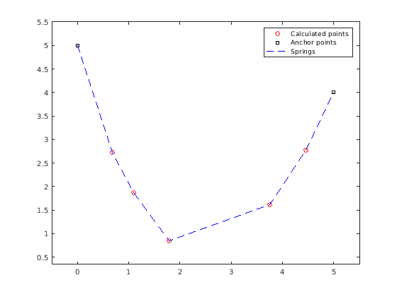 pp = v(1:2*ml); pp = reshape(pp,2,[]); pp = pp'; plot(pp(:,1),pp(:,2),'ro') hold on xx = [x0,xn]'; plot(xx(:,1),xx(:,2),'ks') xlim([x0(1)-0.5,xn(1)+0.5]) ylim([min(pp(:,2))-0.5,max(x0(2),xn(2))+0.5]) xxx = [x0';pp;xn']; plot(xxx(:,1),xxx(:,2),'b--') legend('Calculated points','Anchor points','Springs','Location',"best") hold off