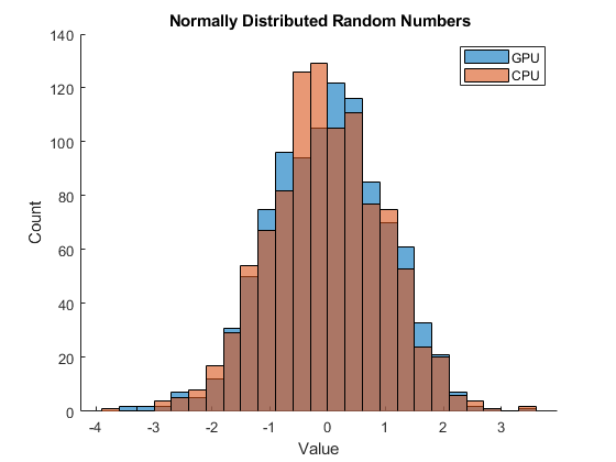 Статистические данные нормального распределения случайных чисел являются тем же самым на графическом процессоре и центральном процессоре.
