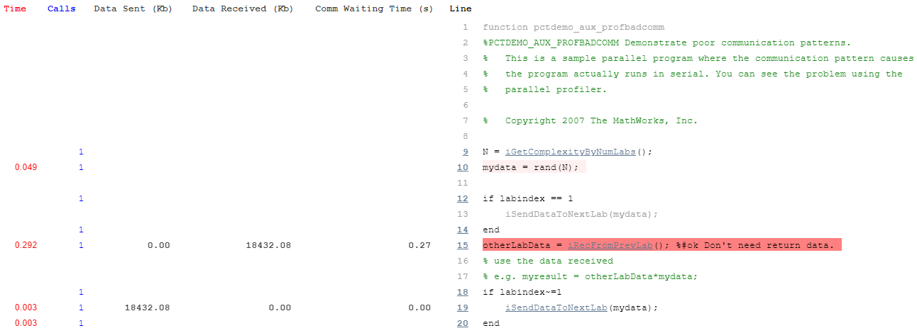 Пример кода включает явную коммуникацию. В MATLAB® явная коммуникация синонимична с прямым использованием коммуникационных примитивов Parallel Computing Toolbox (например, labSend, labReceive, labSendReceive, labBarrier). Проблемы эффективности, включающие этот тип коммуникации, если не связанный с используемым оборудованием, могут затруднить трассировку. С параллельным профилировщиком могут быть в интерактивном режиме идентифицированы многие из этих проблем. Важно помнить, что можно разделить различные части программы в отдельные функции. Это может помочь при профилировании, потому что некоторые данные собраны только для каждой функции.