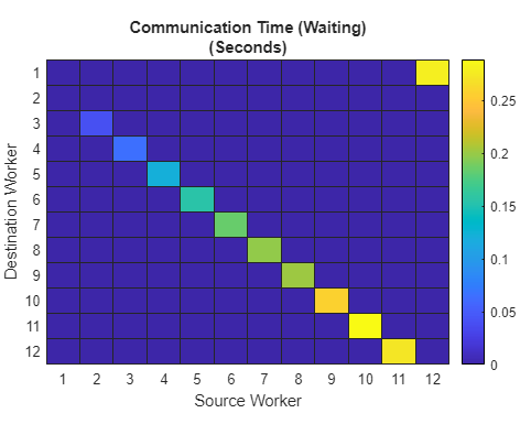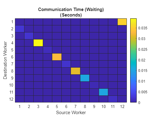 mpiprofile viewerЭта откорректированная версия уменьшает время ожидания, чтобы эффективно обнулить. Чтобы видеть это, просмотрите графики рабочего к коммуникации рабочего для pctdemo_aux_profcomm функция. Используя labSendReceive, тот же коммуникационный шаблон теперь не проводит почти времени, ожидая, как показано в следующий Коммуникационный Раз (Ожидая) график.