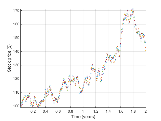 price = stockPrice; time = 0; hold on; while time < timeToExpiry time = time + sampleRate; drift = (riskFreeRate - dividend - volatility*volatility/2)*sampleRate; perturbation = volatility*sqrt( sampleRate )*randn(); price = price*exp(drift + perturbation); plot( time, price, '.' ); end axis tight; grid on; xlabel( 'Time (years)' ); ylabel( 'Stock price ($)' );
