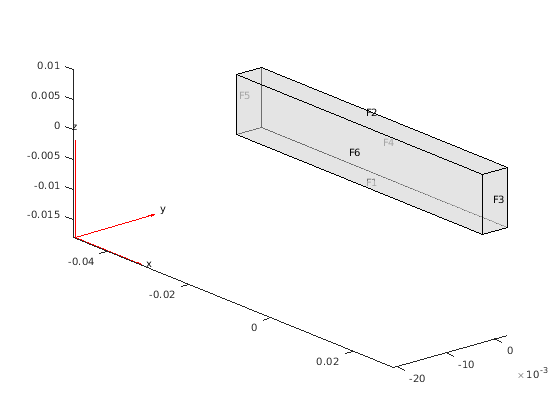 gm = multicuboid(0.06,0.005,0.01); staticmodel.Geometry = gm; pdegplot(staticmodel,'FaceLabels','on','FaceAlpha',0.5) view(50,20)