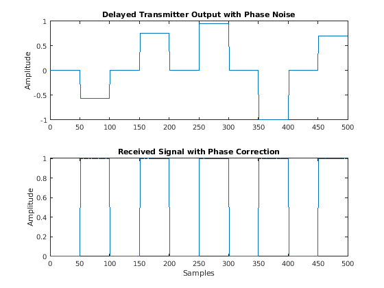 Figure contains 2 axes objects. Axes object 1 with title Delayed Transmitter Output with Phase Noise contains an object of type line. Axes object 2 with title Received Signal with Phase Correction contains an object of type line.