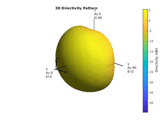 %Define az and el vectors az = 0:2:360; el = 90:-2:-90; % Calculate power pattern giso = pattern(r,freq,az,el,'Type','power'); % Calculated impedance Ziso = impedance(r,freq);