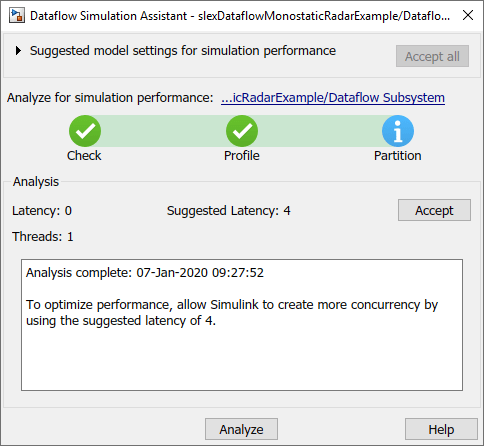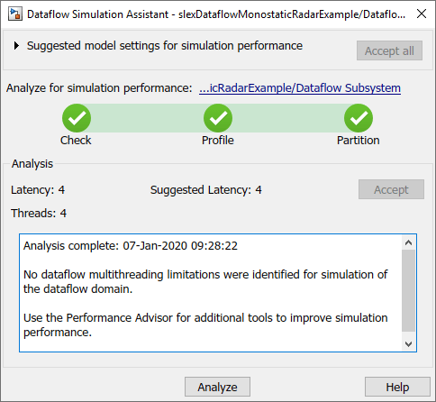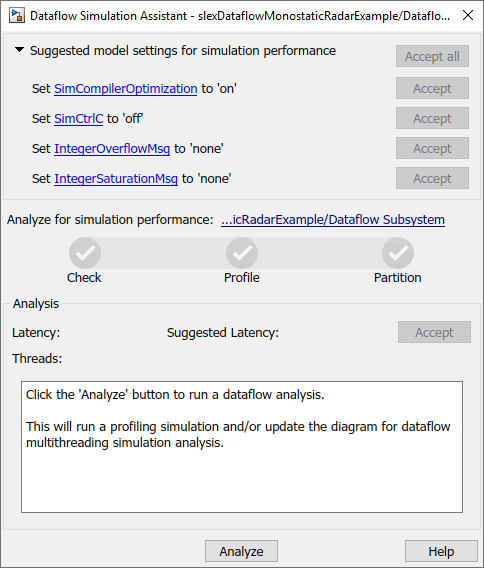 Ассистент Симуляции Потока данных предлагает изменить настройки модели для оптимальной эффективности симуляции. Чтобы принять предложенные настройки модели, рядом с настройками модели Suggested для эффективности симуляции, нажмите кнопку Принять все. В качестве альтернативы можно расширить раздел, чтобы изменить настройки индивидуально. В этом примере настройки модели уже оптимальны. В Ассистенте Симуляции Потока данных нажмите кнопку Analyze, чтобы запустить анализ области потока данных для эффективности симуляции. Если анализ закончен, Ассистент Симуляции Потока данных показывает, сколько потоков подсистема потока данных будет использовать в процессе моделирования.