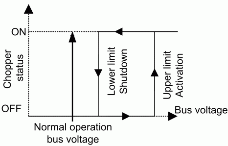 Динамическое торможение активируется, когда напряжение на шине достигает верхнего предела гистерезисной полосы. Значением по умолчанию является 320. Логика Гистерезиса Прерывателя фигуры показывает тормозящую логику гистерезиса прерывателя.