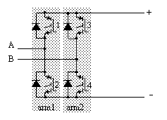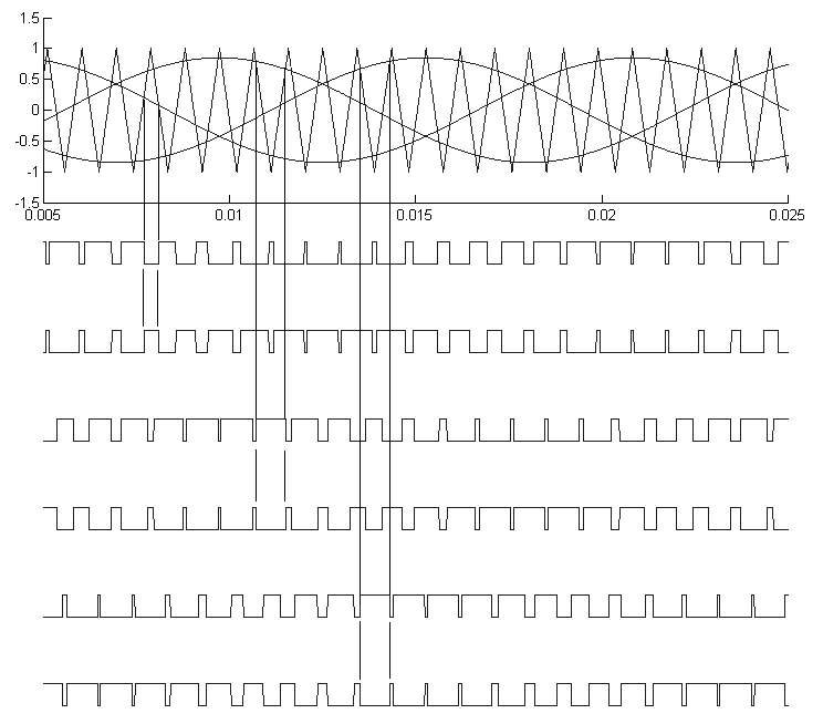 Поскольку однофазная 2D рука соединяет сигнал модуляции, используемый для руки 2, отрицание модуляции сигнала, используемого для руки 1 (180 сдвигов фазы степеней). Для трехфазного моста с шестью руками три сигнала модуляции, используемые для моста 2, являются отрицанием сигналов модуляции, примененных к мосту 1.